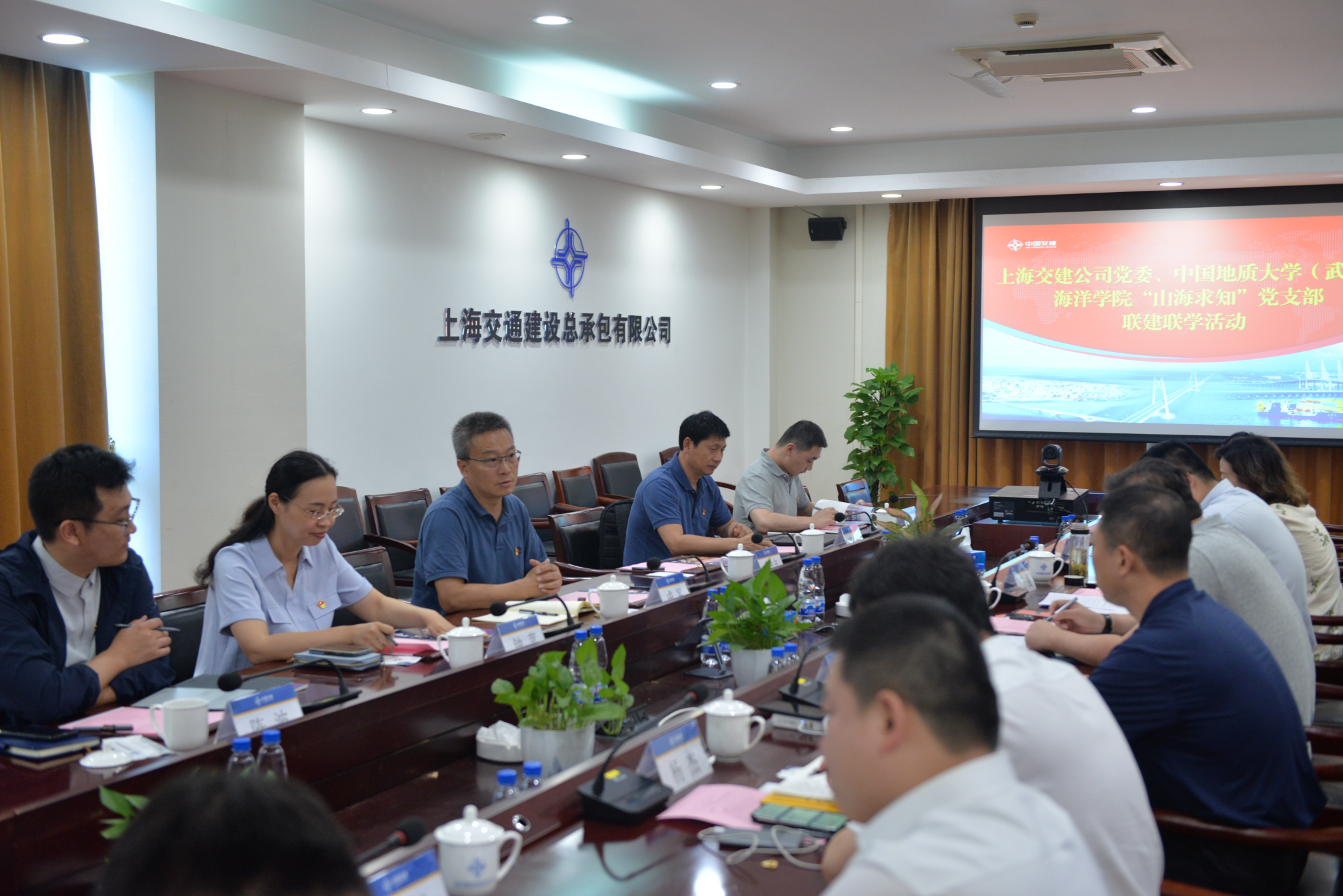 海洋学院党委书记成军介绍中国地质大学和海洋学院的基本情况。他表示此行来到上海交建开展党建共建活动是海洋学院与单位深化合作的良好开端,期待后期能够在人才培养、就业工作、科研合作、单位人员学历提升等方面深化合作,以期做到优势互补、共同发展。