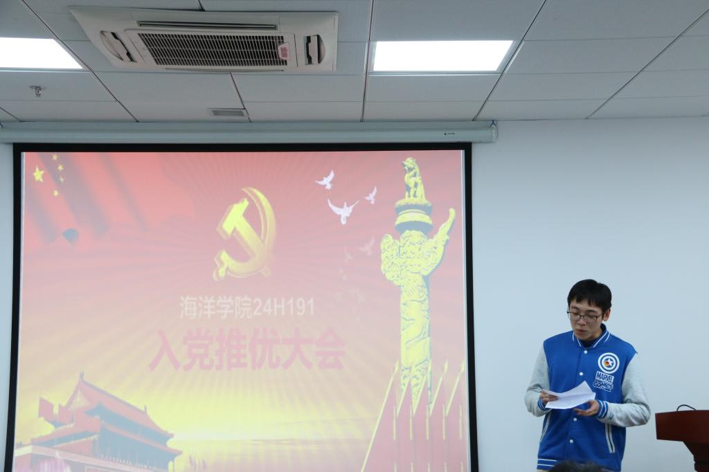 (通讯员:王锦怡)2019年10月26日下午,海洋学院24H191班团支部于东教A1805举行入党推优大会。本次大会由班长吴天婷主持,本科生党支部书记黄开旗同志出席会议,大会应到30人,实到26人,4人请假。