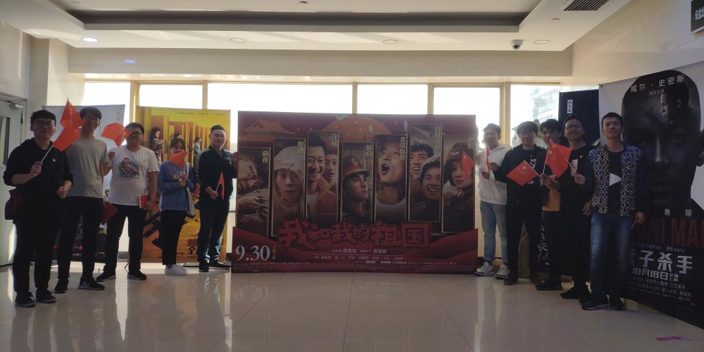 共十名19级研究生党员参与本次活动,10月9日下午一点五十在西区东一门集合,并于校门处合影为祖国70周年华诞献礼。随后搭乘公交车前往影院,按照党员活动要求同时体现爱国爱党热情,所有党员同志按照要求佩戴党徽,携带一面小型国旗。