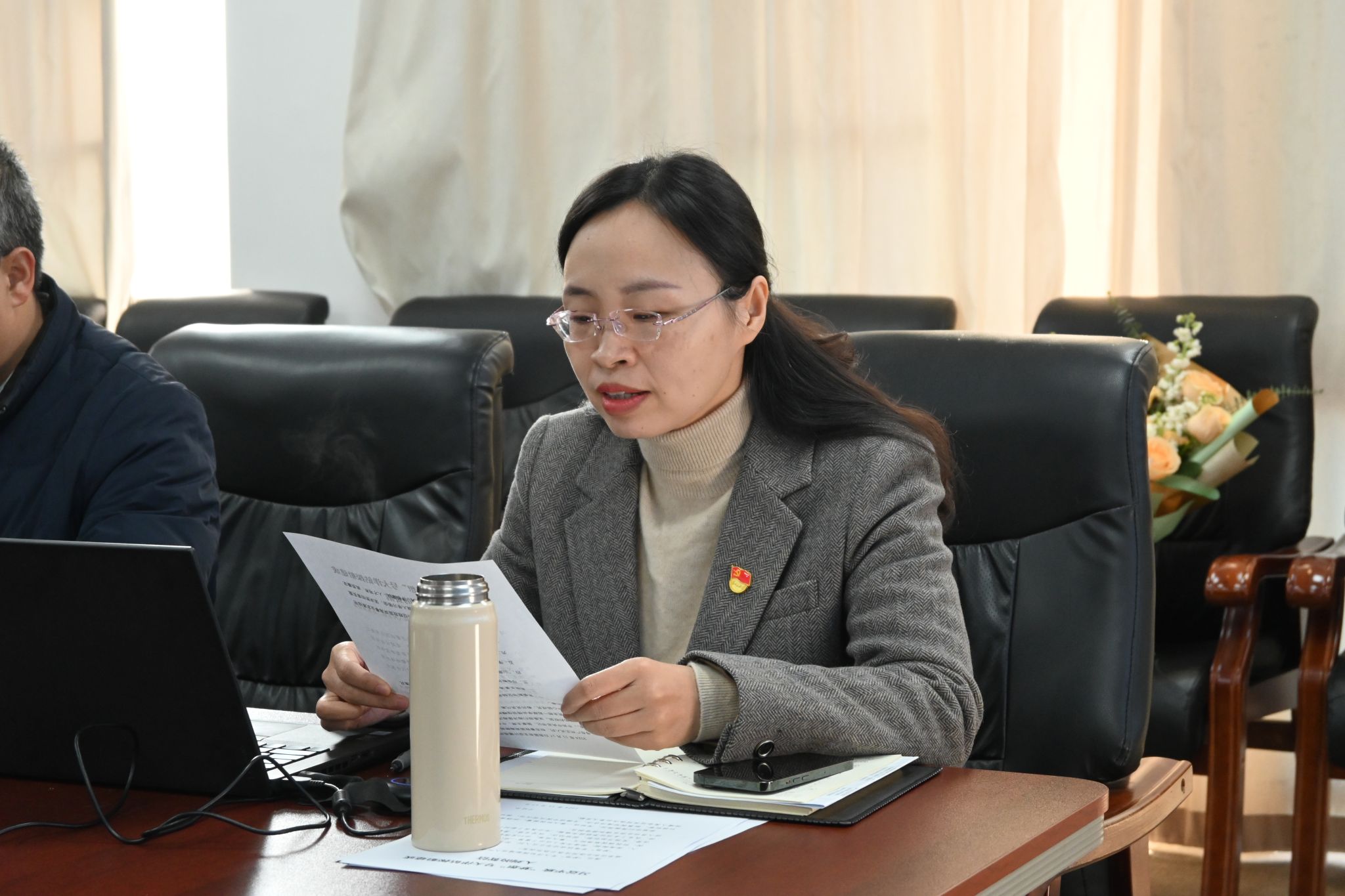 会议期间,严伊杰向副院长姜涛教授献花,表达了学院青年学子对姜涛教授的敬意。