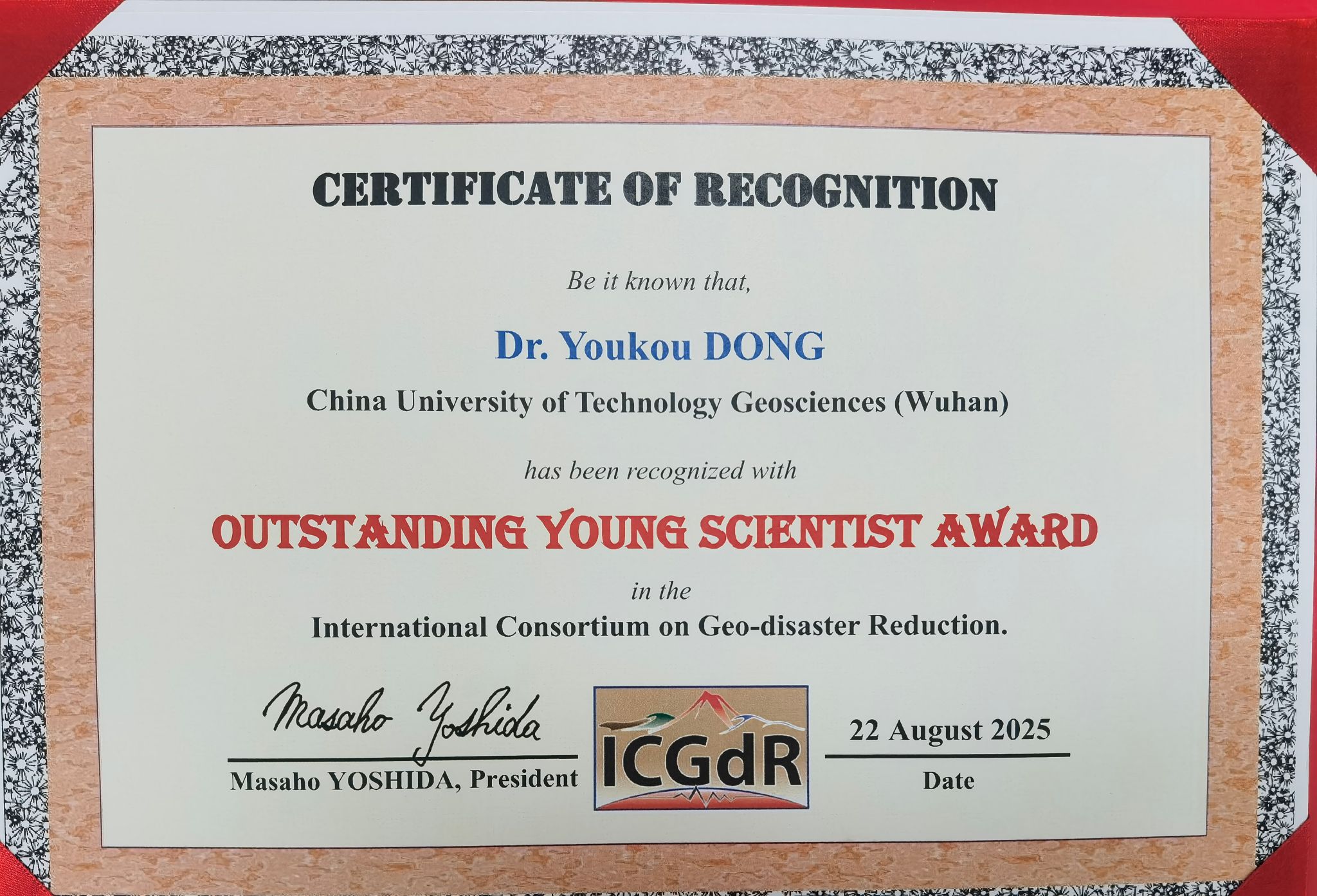 8月23日-26日,由国际地质灾害与减灾协会(ICGdR)主办的第23届国际地质灾害与减灾研讨会(ISGdR 2025)在宜宾召开。会上,我院董友扣教授荣获2025年度国际地质灾害与减灾协会“杰出青年科学家奖”(ICGdR Outstanding Young Scientist Award)。