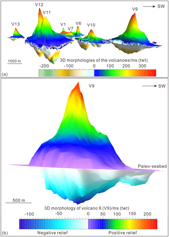 1:深水火山三维结构特征(上部锥形火山体以及下部火山喷口形凹陷)