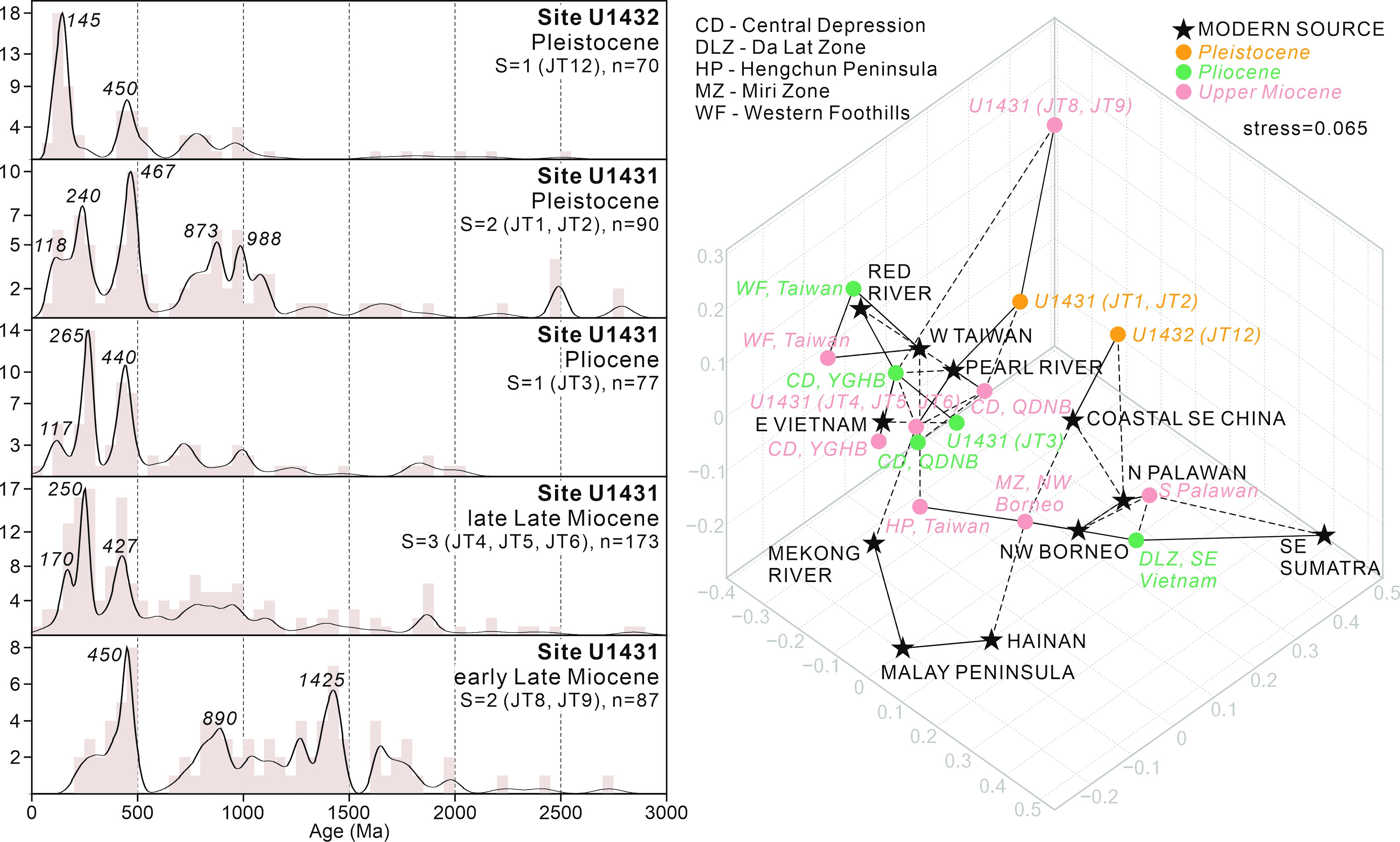 我院姜涛教授、曹立成副教授等近期针对IODP349航次U1431和U1432站位获得的浊积岩样品开展重矿物和碎屑锆石U-Pb测年分析(图1)。锆石颗粒在河流中以推移质搬运为主,并且主要沉积在陆架附近,这一特征使得南海海盆中的碎屑锆石可以示踪周缘亚洲陆块不同河流的物源贡献。该研究团队近些年在南海北部莺歌海盆地、琼东南盆地、珠江口盆地和台西南盆地等地开展了系统的物源调查,揭示了红河、珠江、海南岛水系的演化过程以及沉积物在盆地范围的运移特征,这些前期成果为开展南海地区同时代地层的物源对比分析奠定重要基础。
