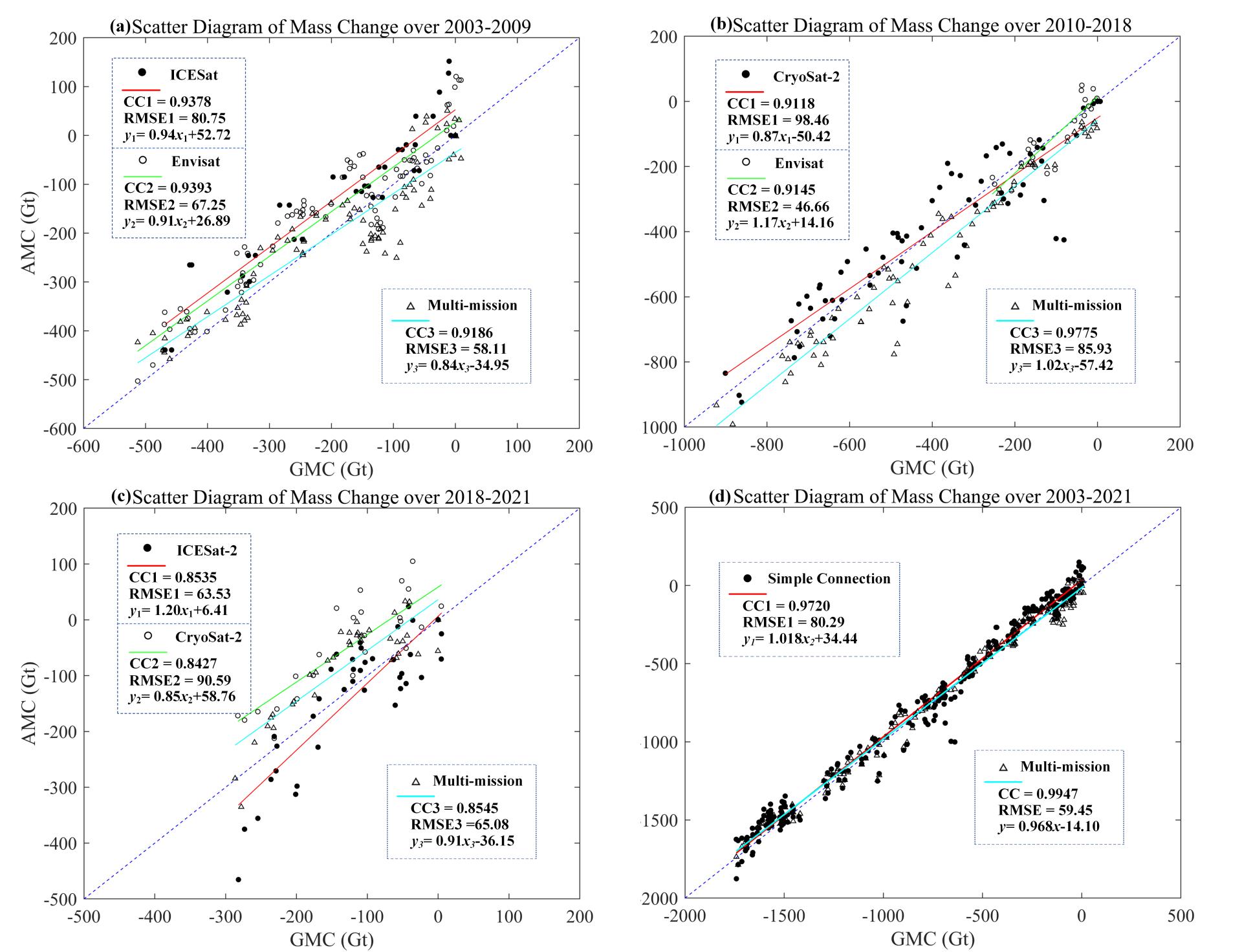 3 2003-2009(a)2010-2017(b)2018-2021(c)2003-2021(d)卫星测高估计得到的质量变化与GRACE/GFO卫星重力数据间散点图