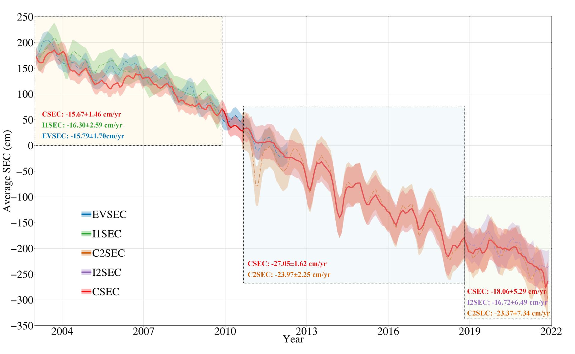 随着全球气候变化频繁加剧,南极洲阿蒙森海湾(ASE)周边冰川冰架融化以及冰层变薄造成大量冰川融水流入海洋,直接导致全球海平面快速上升。因此精确量化分析该地区冰盖高程时空演变,对预测未来全球海平面变化,具有重要的科学和现实意义。考虑不同高度计任务的特点和测量精度,文中提出了一种改进的最小二乘平面拟合方法(ILSPFM),实现多任务雷达和激光卫星测高数据的融合。利用EnvisatICESatICESat-2CryoSat-2观测数据,重建了2003-2021年阿蒙森海冰流域冰盖表面高程月变化记录。改进方法得到的融合质量变化结果相较于单一卫星数据的简单组合,均方根误差减少了25%,并与IceBridge机载激光测高和GRACE Mascon产品保持了良好的时空一致性。