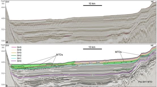 图1 南海东北陆缘第四纪高频海底滑坡及区域薄弱层(SH1-SH5)垂向分布