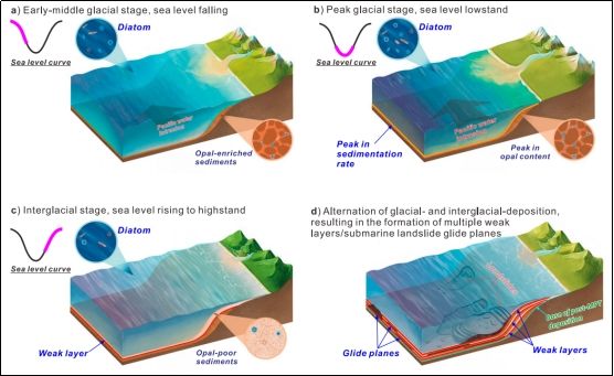 图3 海底薄弱层沉积概念模式图。海平面下降期间,富含蛋白石层持续沉积(a),直至冰期最低海平面时期,蛋白石含量与沉积物供给量均达到峰值(b)。海平面上升至高水位期时(c),沉积物供给减少,形成贫蛋白石层位。冰期-间冰期沉积界面处沉积特征与抗剪强度发生显著变化,形成薄弱层孕育海底滑坡(c、d)。