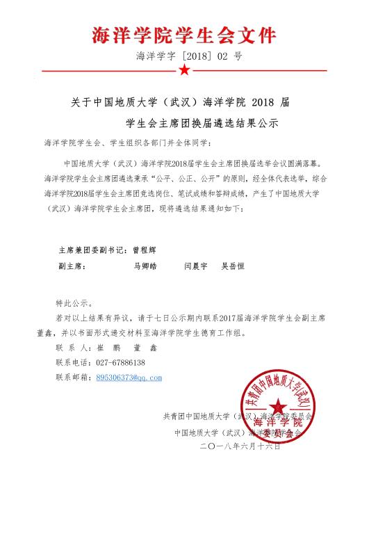 关于中国地质大学(武汉)海洋学院 2018 届学生会主席团换届遴选结果公示