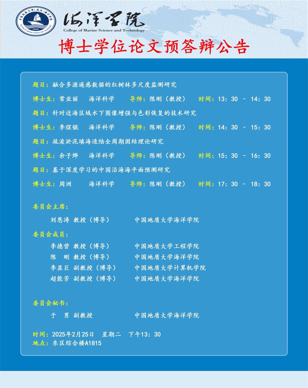海洋学院2025年春博士学位论文预答辩公告(2月25日)