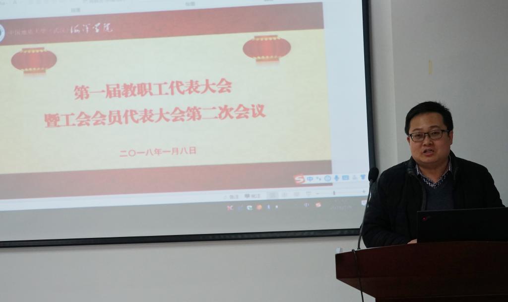 (武汉)海洋学院第一届教职工大会第二次会议暨第一届工会会员大会第二次会议在丝绸之路学院105室隆重开幕,会议由院党委书记解习农同志主持,工会副主席高复阳同志到会祝贺并致贺词。