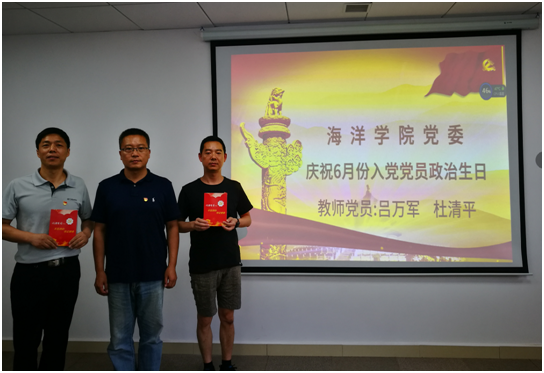 在全体党员的见证下,成军书记给六月份入党的教师党员吕万军、杜清平过政治生日,赠送政治生日贺卡,并勉励两位同志不忘初心、牢记使命、知行合一、砥砺前行,努力做新时代合格党员,为学院建设和发展做出新贡献。