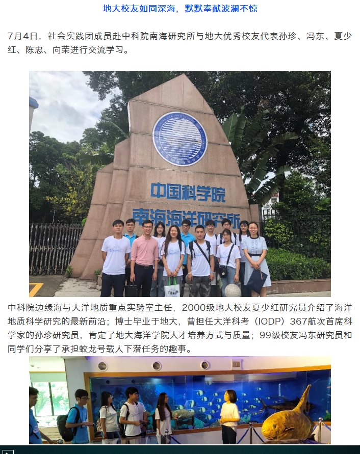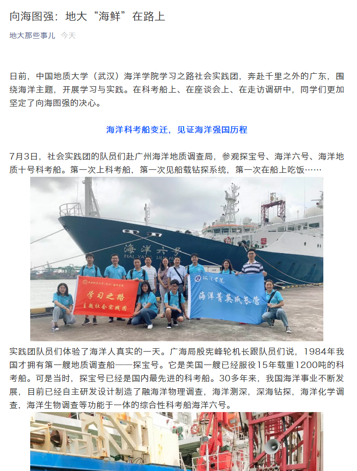 报道从“海洋科考船变迁,见证海洋强国历程”、“地大校友如同深海,默默奉献波澜不惊”、 “练就过硬专业本领,树立谋海济国之志”、“走进港珠澳大桥,找到奋斗的动力”四个专题部分对51风流 “学海洋强国思想,践向海图强之路”的暑期社会实践活动进行详细的报道。