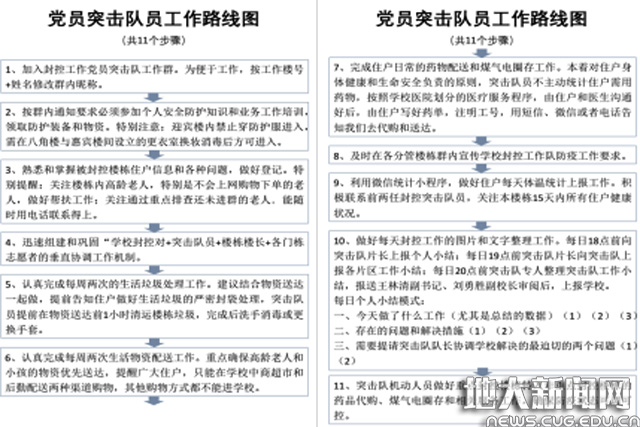 地大社区包括东区教职工小区、南望山庄和喻家山庄小区,现有住户1940户,常住居民5860人。目前对24个楼栋出现确诊或疑似病例的居民楼进行重点封控,成立了封控应急工作队,每批队员工作时间为一周,主要工作任务四项:一是全面、精准掌握重点封控楼栋住户信息、畅通信息传递渠道;二是为相关楼栋居民配送生活物资;三是转运生活垃圾;四是为部分确有急需的家庭提供取送药品、天然气圈存等服务。