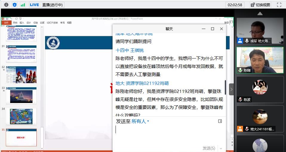 各学院同学、武汉市第十四中学为代表的优秀生源基地同学们就海洋与珠峰研究前沿问题进行了互动交流。