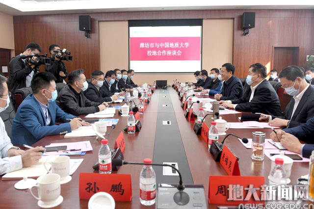 王焰新代表学校对惠新安一行的到来表示热烈欢迎。他说,海洋科学是地球科学的重要分支之一,学校拥有完整的海洋科学教育体系,深化与潍坊的校地合作对于学校学科发展具有重要意义。学校将深入贯彻落实习近平总书记在科学家座谈会上的讲话精神等系列重要讲话精神,充分发挥学科、人才综合优势,坚持面向世界科技前沿、面向经济主战场、面向国家重大需求、面向人民生命健康开展科技创新、加强区域合作,不断提高人才培养质量、科技创新水平、社会服务能力。他要求学校相关部门加强与潍坊市的沟通交流,促成校地双方成为紧密的、长期的、友好的合作伙伴关系,实现共赢。