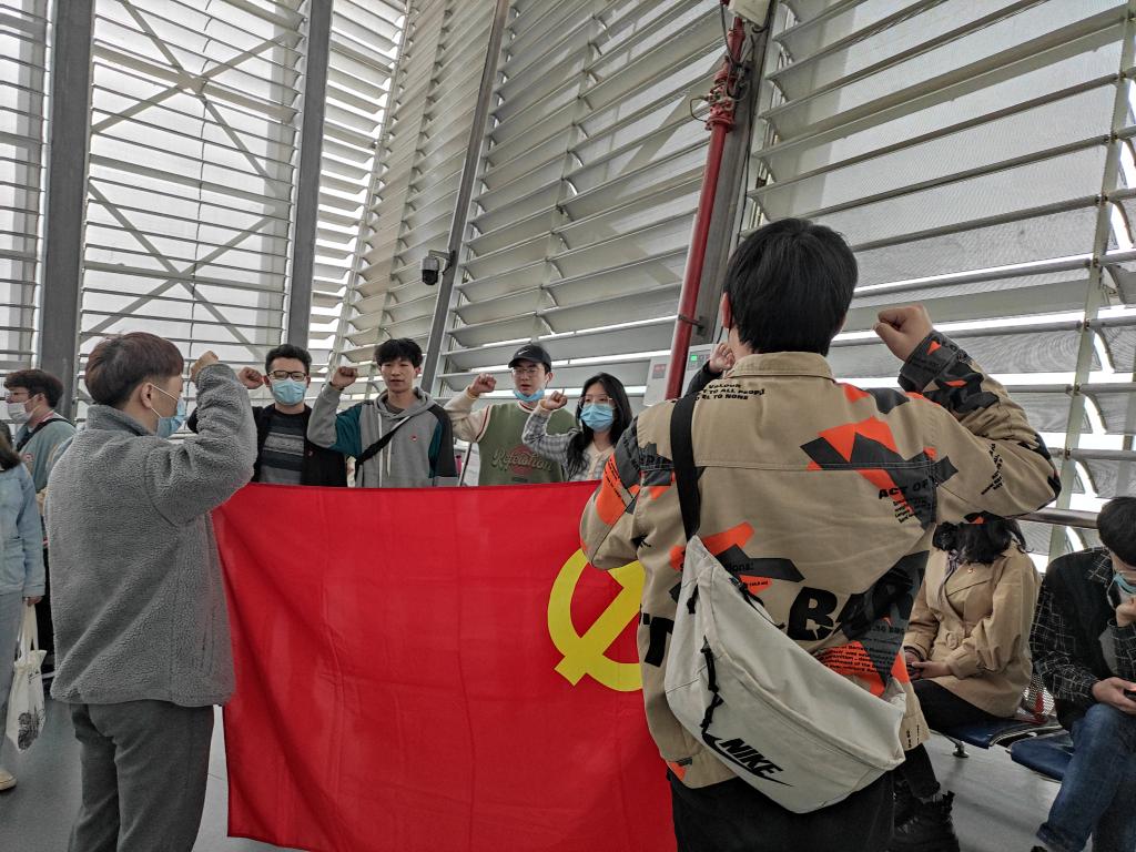 在中山舰前的二楼平台上,全体党员重温入党誓词,铿锵的言语中包含着坚定的强国志愿。