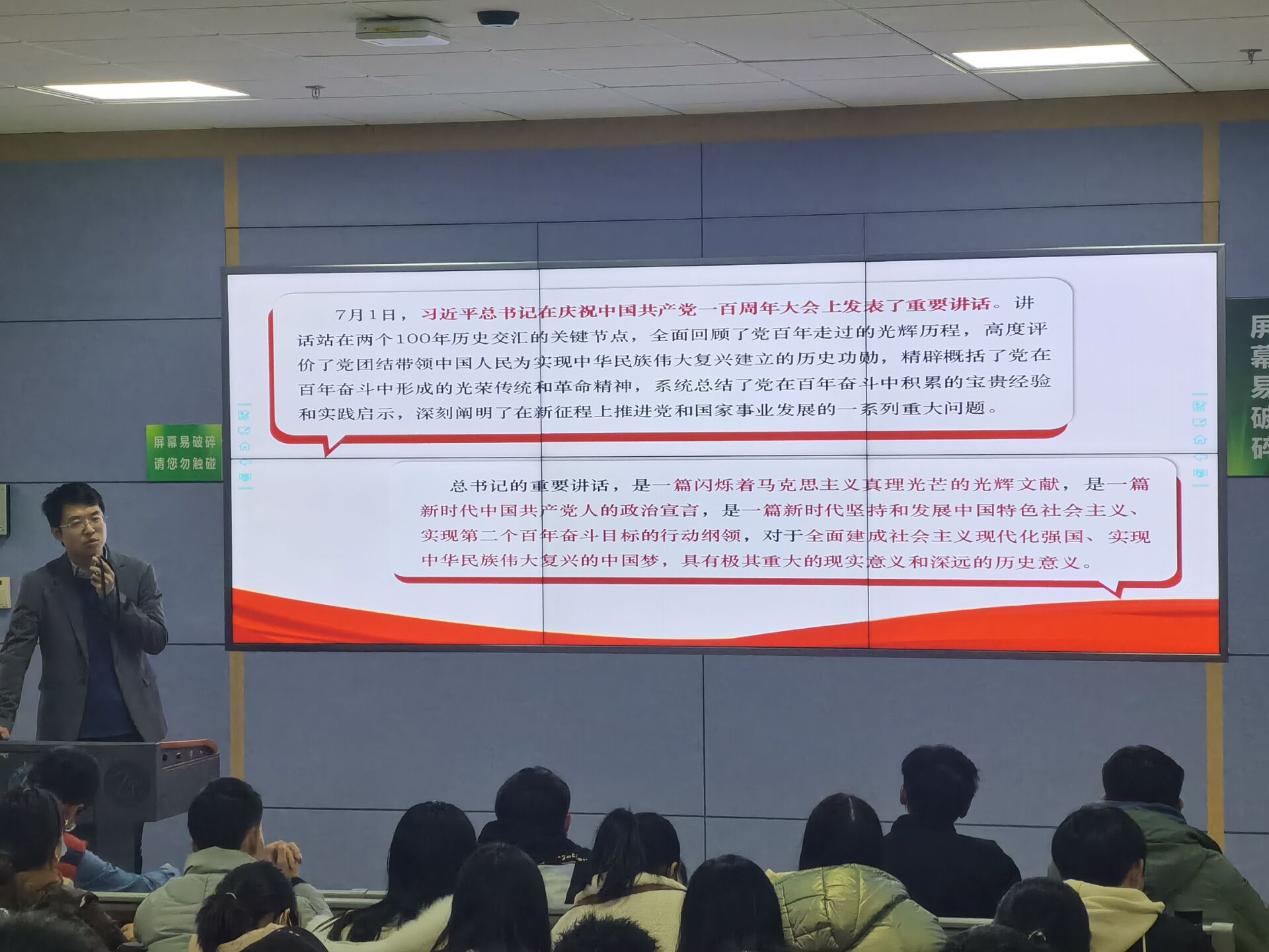 孙宇涛老师带领同学们一起学习党的十九届六中全会精神。他此讲的主要内容,介绍十九届六中全会会议,阐释了党的百年奋斗的重大成就与党的百年奋斗的历史经验,强调不忘初心推进中华民族伟大复兴的使命。鼓励同学们积极响应党中央号召,埋头苦干、勇毅前行,为实现第二个百年目标努力奋斗。让同学们在激励中深刻认识到党的十九届六中全会精神。