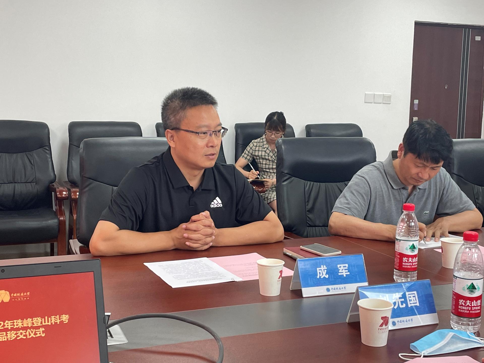 “7+2”登山科考活动内容的极大丰富,并代表学校向陈刚教授的捐赠表示衷心的感谢。他强调,每一件实物都述说着攀登珠峰过程中惊心动魄的故事,接受捐赠物品的单位要保存好、运用好相关捐赠物品,最大程度的发挥其中的科研价值和文化价值。他要求,各单位要以此为契机,讲好“地大攀登故事”,刻画“地大攀登形象”,助推地大校园文化建设,为学校70周年校庆增光添彩。