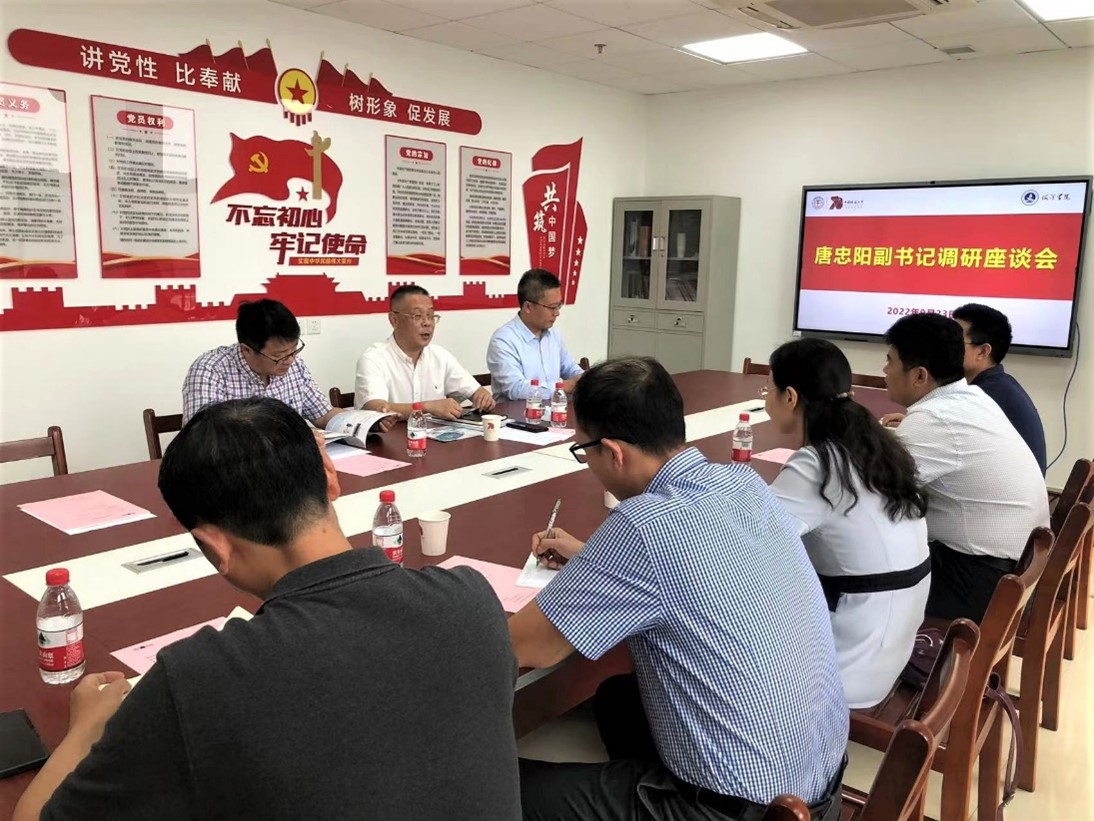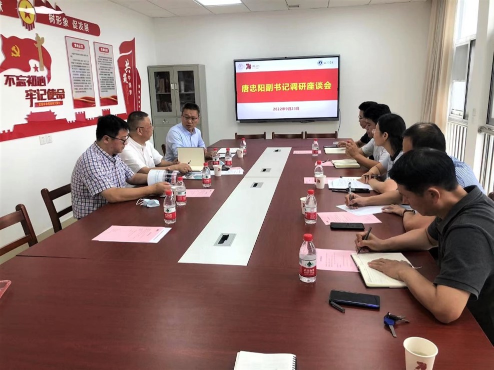(通讯员 韩瑞)2022年9月23日下午,校党委副书记唐忠阳到学院调研,听取学院事业发展情况汇报,指导学院工作。他明确要求学院,要精心谋划发展,追求学术卓越,全面深化改革,激发办学活力,发挥主观能动性,进一步提升办学影响力和科教竞争力,扎实推进“双一流”建设。