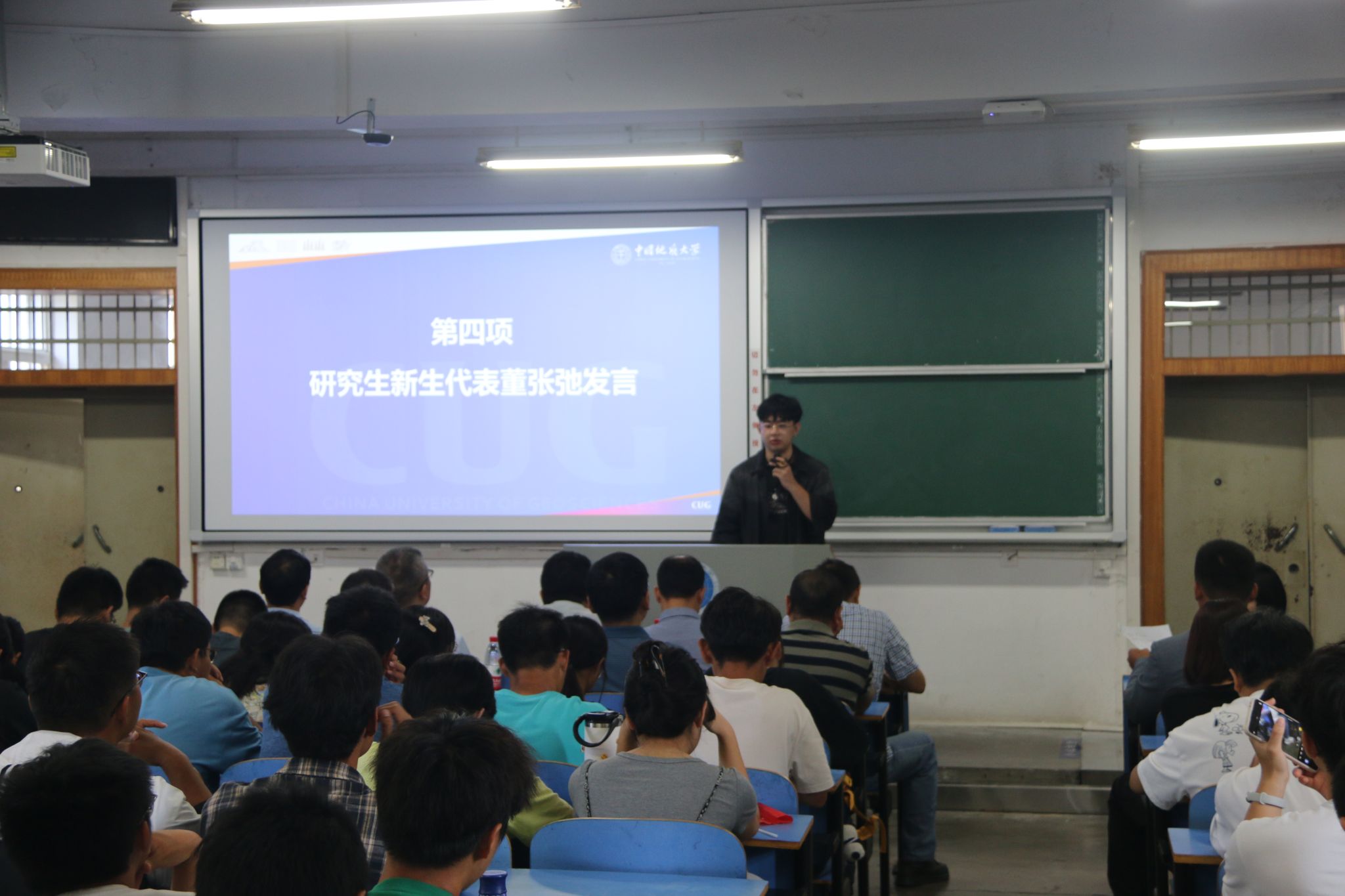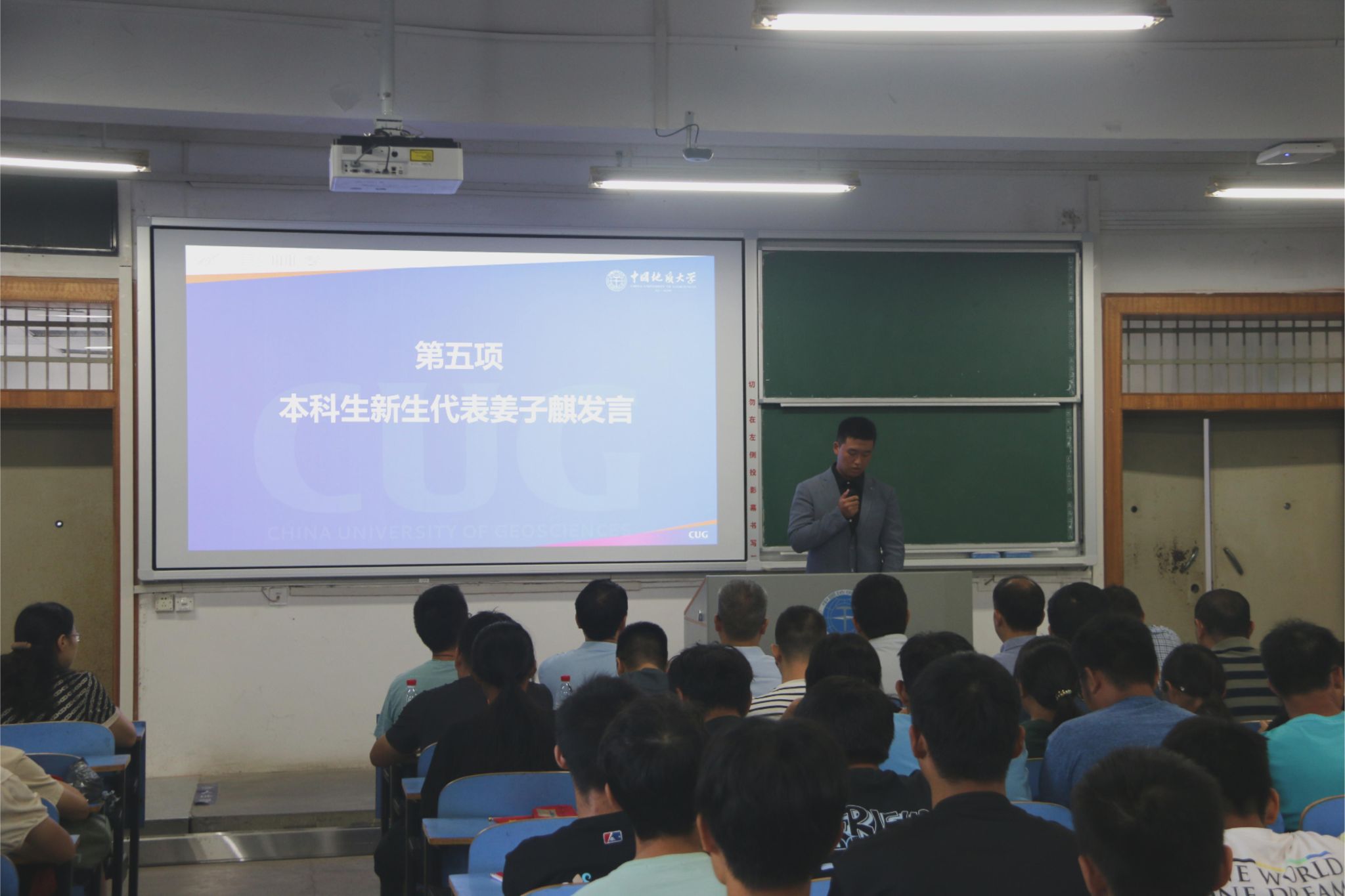 高年级学生代表董张弛同学发言。董张弛同学分享了自己扮演李四光先生的话剧表演经历,从李四光先生身上学习到了“要学会担当要付得起责任”、“你的追求和梦想不能变”等精神,从而不断在学业生活中超越自我。