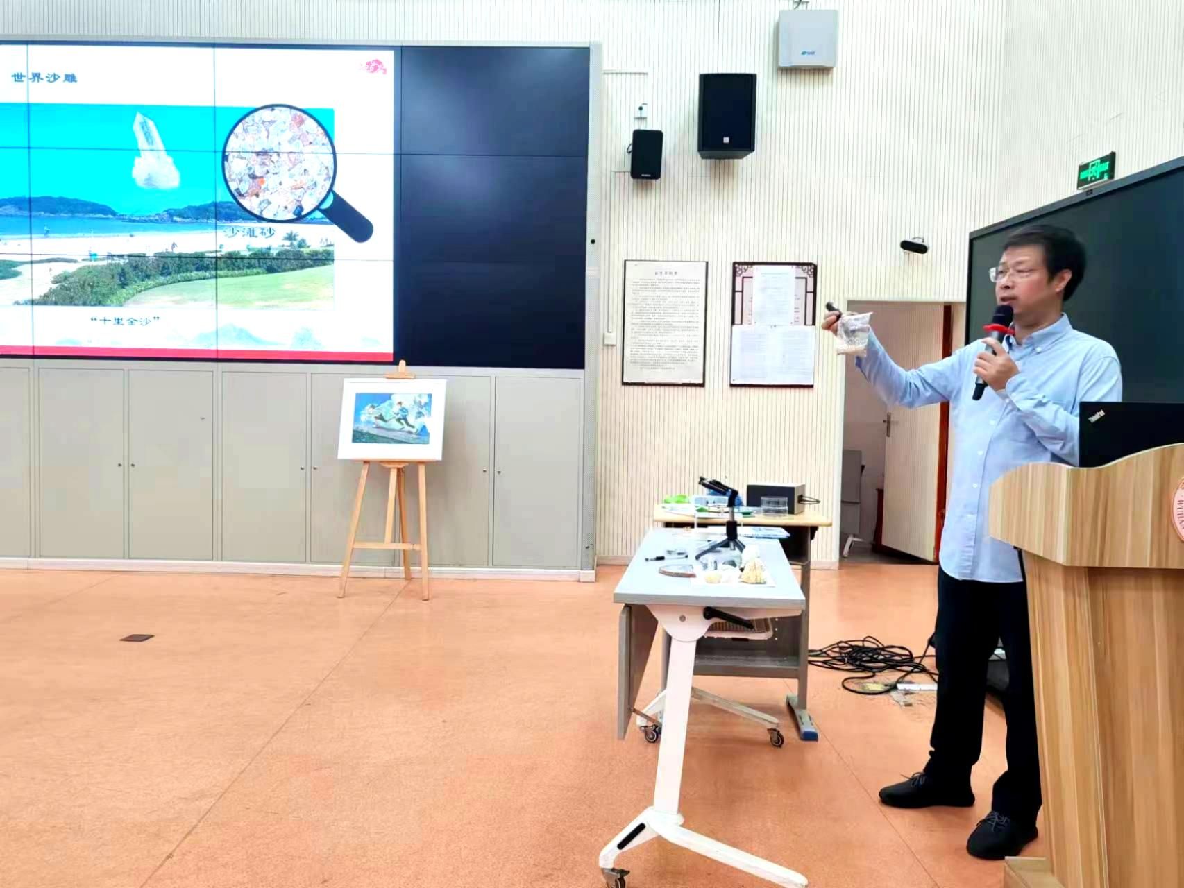 他特别展示了舟山海岸带石英砂显微图像,引导学生通过矿物结晶形态推演地质年代,将深奥理论转化为可触可感的科学实践。