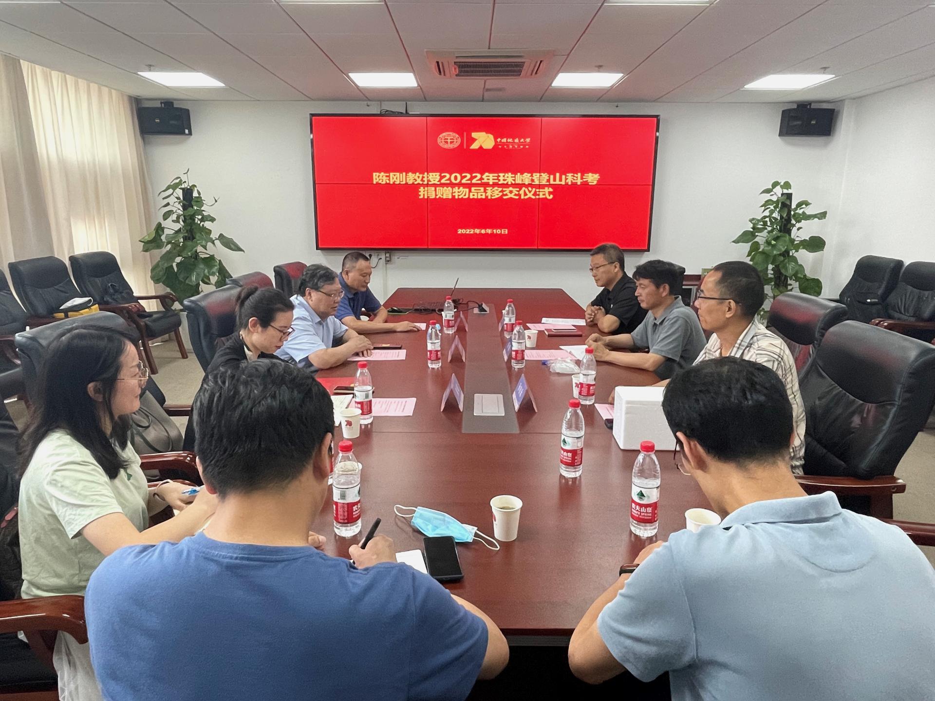 6月10日下午,陈刚教授2022年珠峰登山科考捐赠物品移交仪式在南望山校区东区教学综合楼A1804会议室举行。校党委常委、宣传部部长、校庆工作办公室主任储祖旺,海洋学院陈刚教授,图书档案与文博部、校团委、环境学院和海洋学院等相关单位负责人参加仪式。