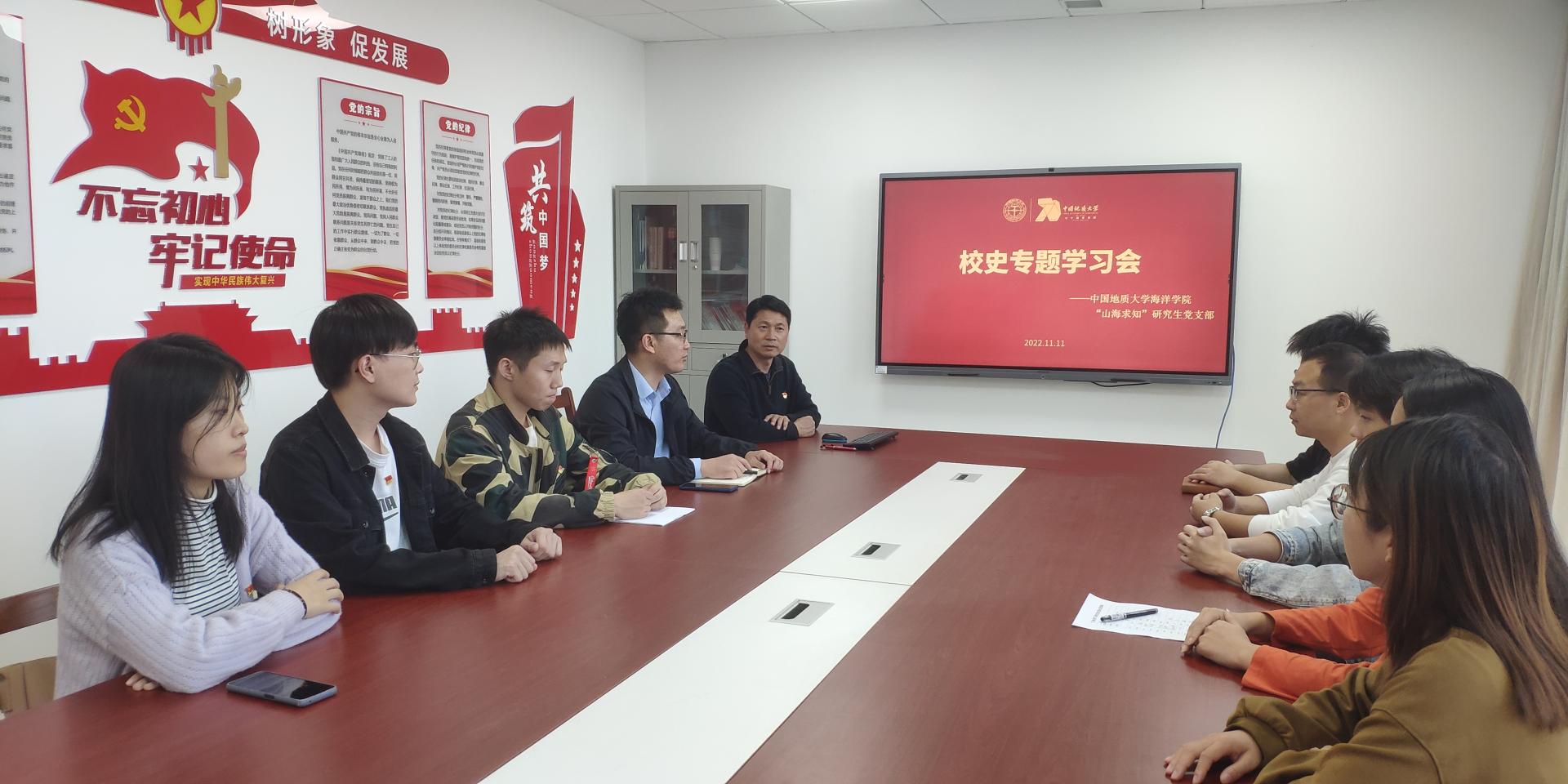 当天下午,“山海求知”研究生党支部举行校史专题学习会。党支部书记陈刚教授为党支部成员讲述了中国地质大学从北京建校到校区南迁70年的历史,介绍了中国地质大学(武汉)与中国地质大学(北京)的历史关系,赞美了高元贵、李四光、何长工、刘型四位建校元勋,带领同志们回忆了地大的红色血脉和难忘的校园岁月。