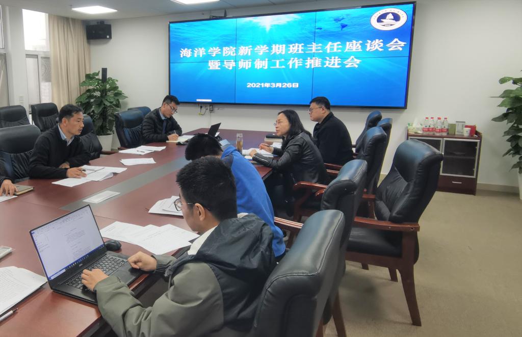 为进一步加强学院学风建设和班级管理,推进学生工作队伍建设,3月26日下午,海洋学院在东教A座1804会议室召开新学期班主任座谈会暨导师制工作推进会。学院副院长姜涛、党委副书记钟苹、各班班主任、2020级本科学务指导导师和全体学工组成员参加活动,座谈会由学院团委书记陈波主持。