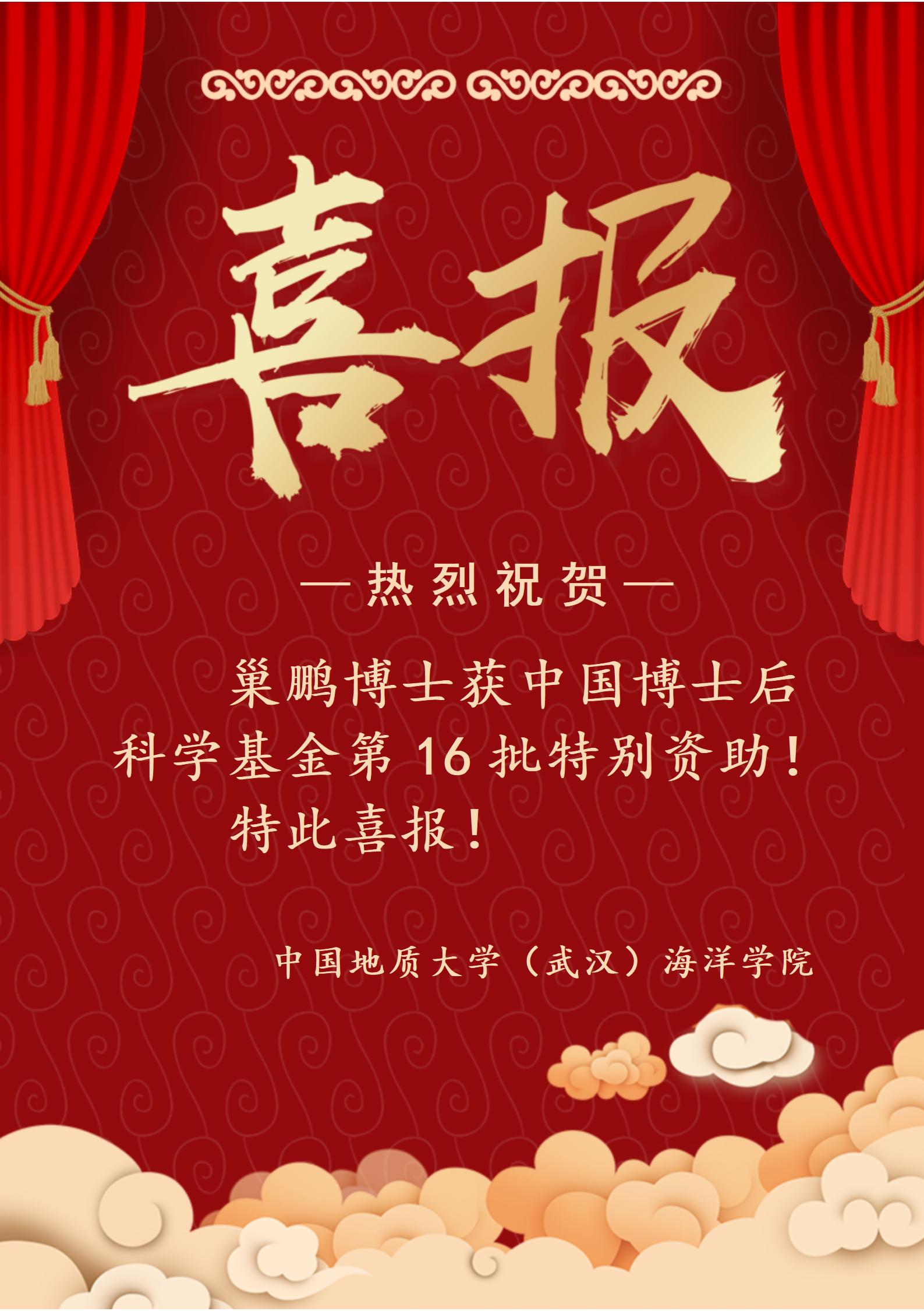 喜报!我院巢鹏博士获中国博士后科学基金第16批特别资助