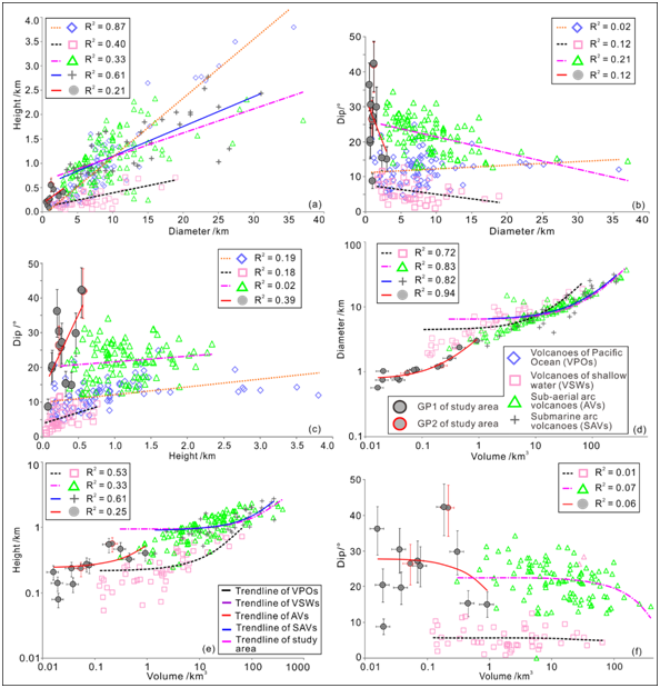 图2:研究区深水火山与陆地(Grosse et al., 2009)、浅水(Magee et al., 2013)、岛弧(Wright et al., 2006)及太平洋深水区火山(洋中脊和海山;Smith, 1988)几何特征对比,可以观察到它们之间有明显的差异和不同的延伸趋势,说明喷发环境对其影响较大。