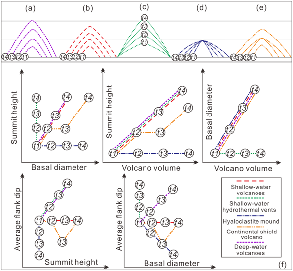 火山生长模式:垂向加积大于横向扩展速度;(b)浅水火山生长模式:垂向加积与横向扩展相等(Magee et al., 2013);(c)浅水火山生长模式:垂向加积主导,直径保持不变(Magee et al., 2013)(d)浅水玄武碎屑岩丘生长模式:高度基本保持不变,横向扩展为主(Calvès et al., 2011);(e)陆地盾状火山生长模式:垂向加积为主,间或短暂横向加积;(f)不同喷发环境火山生长趋势。
