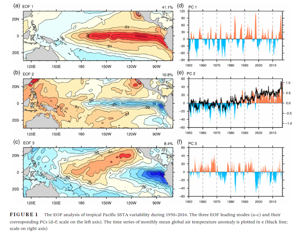 El Niño and Southern Oscillation (ENSO) events are usually monitored bytropical Pacific sea surface temperature anomaly (SSTA) patterns with dra-matic impacts on the global climate. To explore the diversity of the tropicalPacific SSTA, a novel method combined empirical orthogonal function analysi sand the K-means clustering algorithm is carried out to classify SSTA patternsduring 1950–2016. Meanwhile, the total distance variance and total silhouettevalue are introduced to determine an optimal number of distinguishable repre-sentative SSTA patterns. Ten SSTA patterns are obtained, which shows fre-quent basin-wide warming and extreme cold ENSO events in recent decades.It may be attributed to the changes in composition of the intrinsic modes alongwith the background mode of slowly increasing east–west SST gradient. Thecomparative analysis between periods 1950–1969 and 1997–2016 suggests thatthe two regimes of tropical Pacific SSTA, featured as extreme warm and mod-erate warm/extreme cold patterns respectively, become more distinct underrecent global warming.