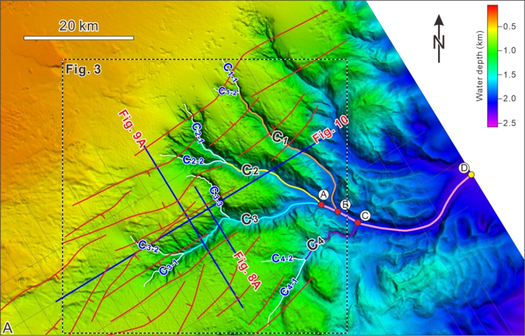 海底峡谷是大陆边缘重要的地貌单元,对沉积物“源—汇”过程及其相关能源资源、海底生态系统和海洋地质灾害等均具有重要影响。根据地貌特征,海底峡谷可分为单支型海底峡谷与树枝型海底峡谷体系。相较于单支型海底峡谷,树枝型海底峡谷体系多分布于构造活跃陆缘,具有活动性强和覆盖面积广等特征,因此可向深海输运更为丰富的陆源碎屑及有机质,为深海油气和天然气水合物聚集成藏提供充足的物质基础和储集空间,同时对深海碳汇过程也有积极作用。虽然当前关于单支型海底峡谷的形成演化已有较为深入的认识,但是对于地貌及地质过程更为复杂的树枝型海底峡谷体系的形成演化机理研究却较为匮乏,亟待展开进一步探索。