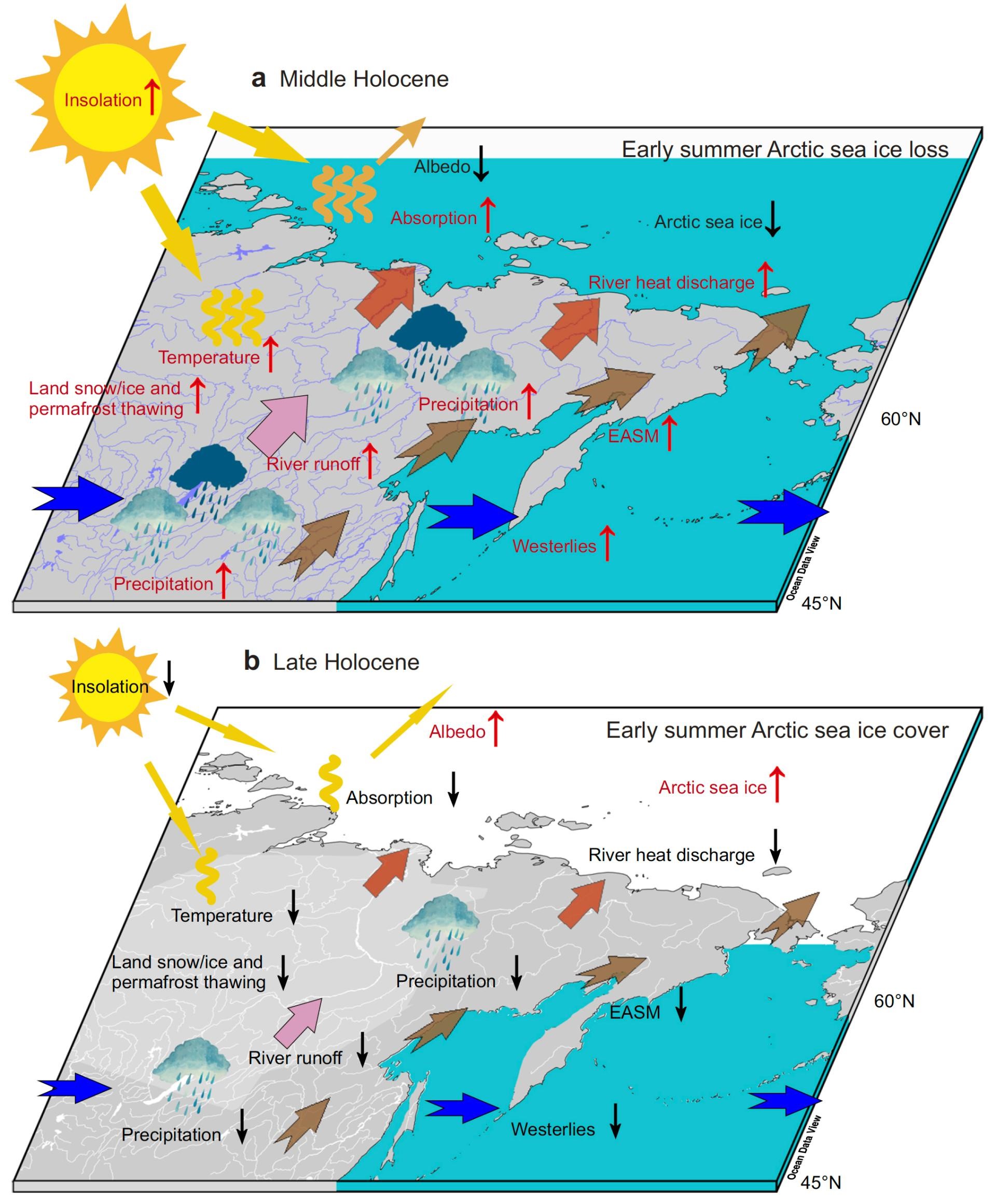 在《中全新世增强的河流热能排放入海促进北冰洋海冰融化》一文中,宫勋与合作者一起基于东西伯利亚陆架沉积岩心,依据放射性碳和石英释光测年技术建立起年代地层框架,分析了其沉积环境,通过冰筏碎屑和沉积速率等指标,结合已有的古气候指标和现代观测数据,重建了全新世东西伯利亚海海冰和俄罗斯泛北极地区河流热能排放的演化历史,着重探讨了中全新世以来(过去7500年)泛北极地区河流热能输入对北极地区海冰震荡的影响机制。研究发现,全新世中期俄罗斯境内泛北极地区河流入海热通量的增加,进而加速了同时期北极海冰的消退。而且,早夏时节强烈的热能排放可以直接融化陆架海冰,降低海冰对太阳辐射的反射率,从而增强其对太阳辐射的吸收速率,对北极海冰消融产生重要正反馈作用。该研究通过“以古论今”视角,指出在现代及未来全球变暖背景下,泛北极地区径流入海热通量将对北极海冰的快速消融起到重要驱动作用。