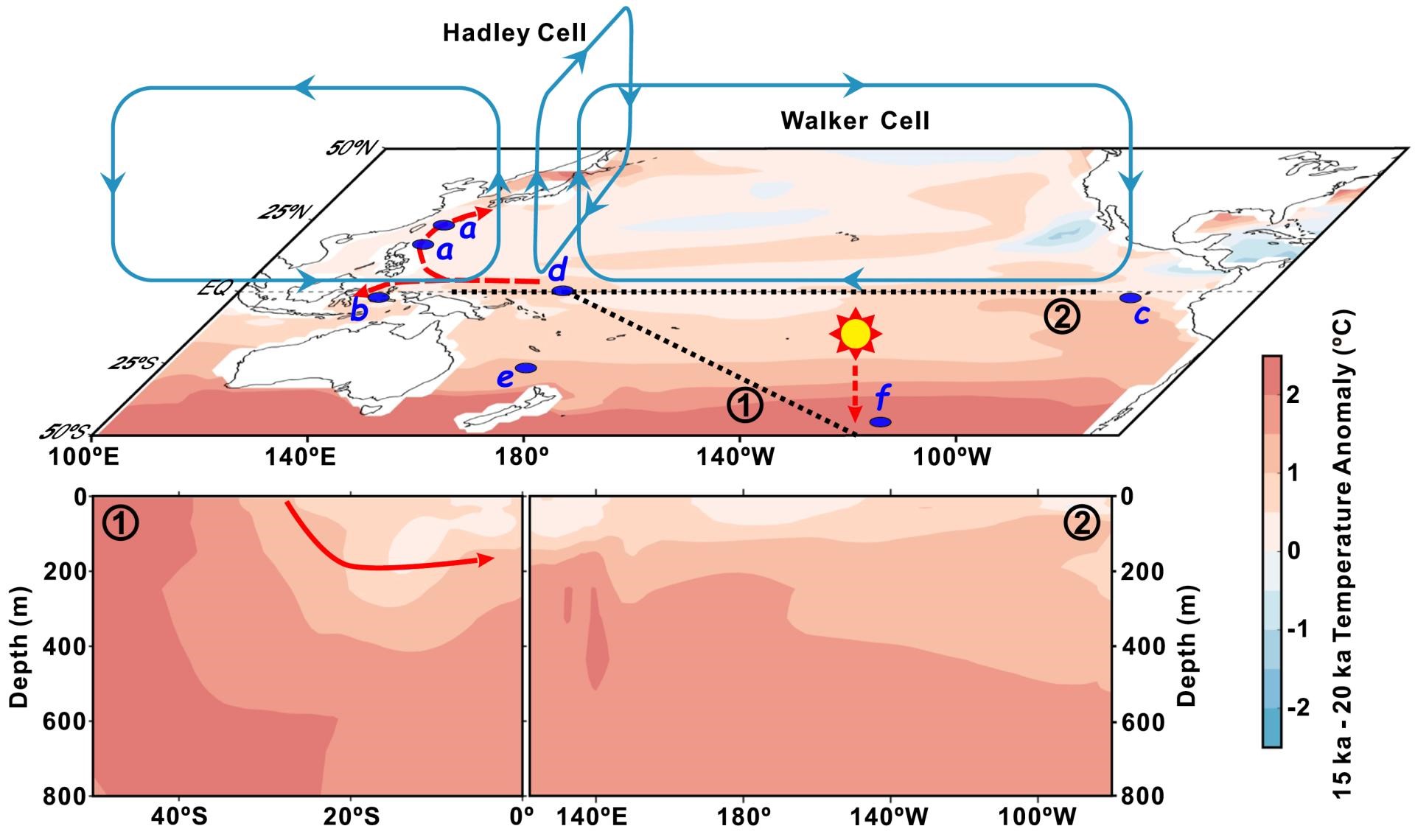 在《过去3万年以来印太暖池与南大洋的热耦合过程》一文中,宫勋与合作者一起通过汇编340个海面和7个地下温度记录以及一个新的海洋热含量记录,讨论了过去3万年以来太平洋水平和垂直热梯度的演变。研究发现,冰消期西太平洋暖池变暖更加强烈,类拉尼娜现象占主导地位,导致暖池中的次表层温度和海洋热含量均比海表温度上升早,且与南太平洋次表层温度在轨道尺度协同演化,意味着热带上层水柱与温带南大洋之间的热交换加速了西太平洋的变暖。这一发现,增进了对“赤道太平洋—南大洋”热耦合过程对全球变暖影响的认识。