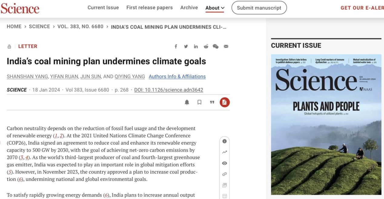 1月18日,我校广州南沙地大滨海研究院生态文明研究团队在《科学》杂志(《Science》)的Letter专栏发表了题为《印度煤矿开采计划将延缓全球气候目标实现》的研究论文。