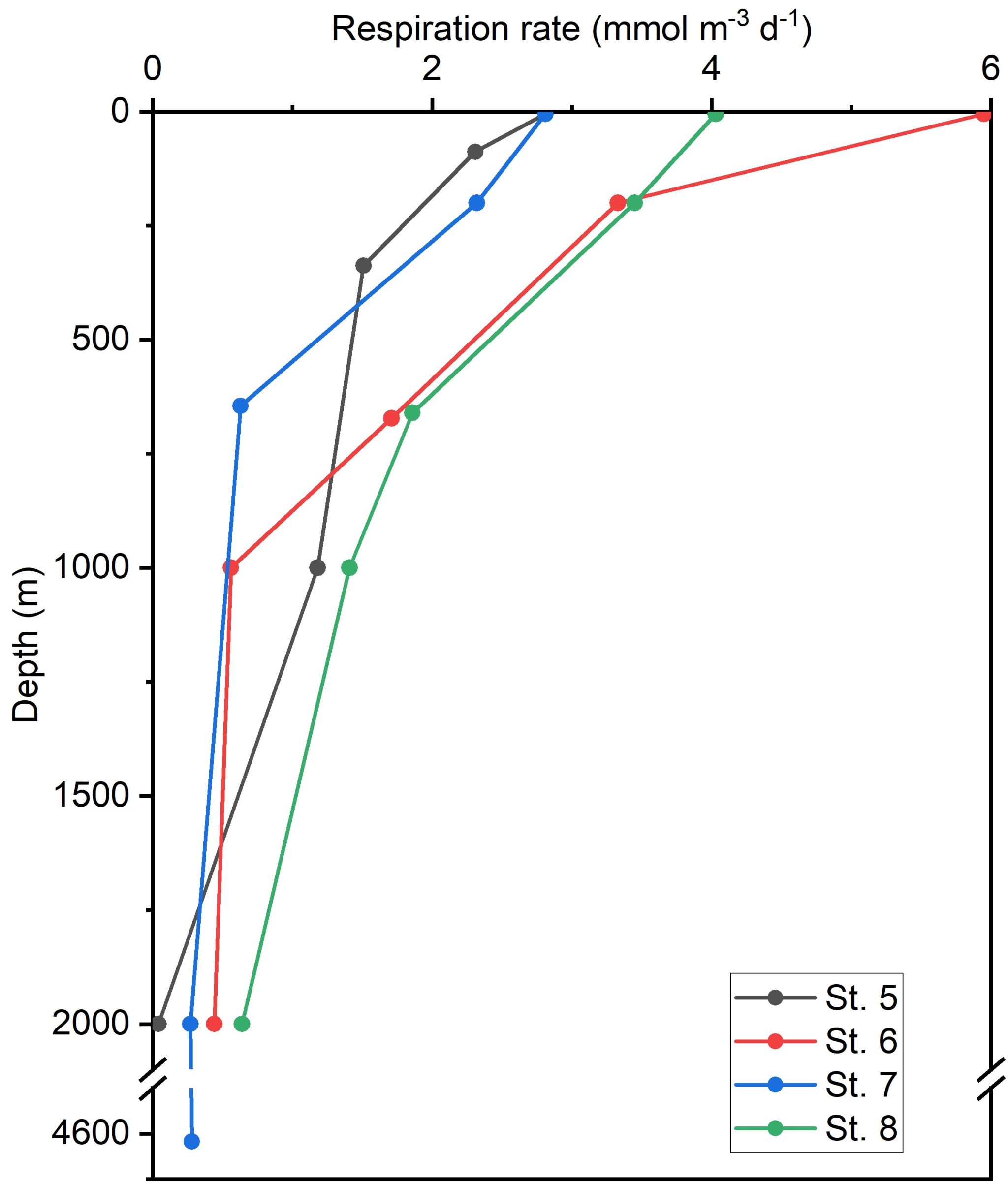2021年春季的呼吸实验结果显示,DIC的产生速率随深度的增加而下降,这主要是由温度控制的。水柱积分的DIC生成速率大小依次为站位8>站位6>站位5>站位7,在很大程度上依赖于微生物的种类和丰度,这揭示了无光深水区的呼吸过程在调节 DIC 变化和海洋碳循环方面也发挥着重要作用。