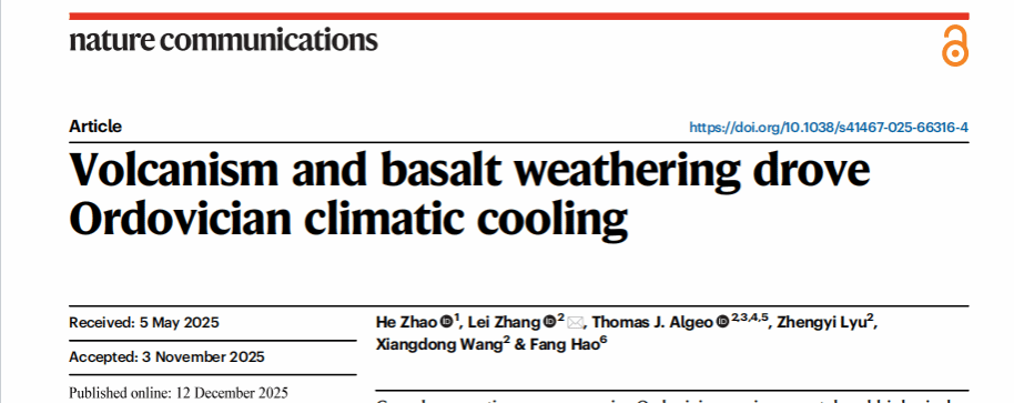 论文信息如下:Zhao He , Zhang Lei, Algeo J. Thomas, Lyu Zhengyi , Wang Xiangdong , Hao Fang . Volcanism and basalt weathering drove Ordovician climatic cooling. Nature Communications 16, 11475 (2025). //doi.org/10.1038/s41467-025-66316-4
