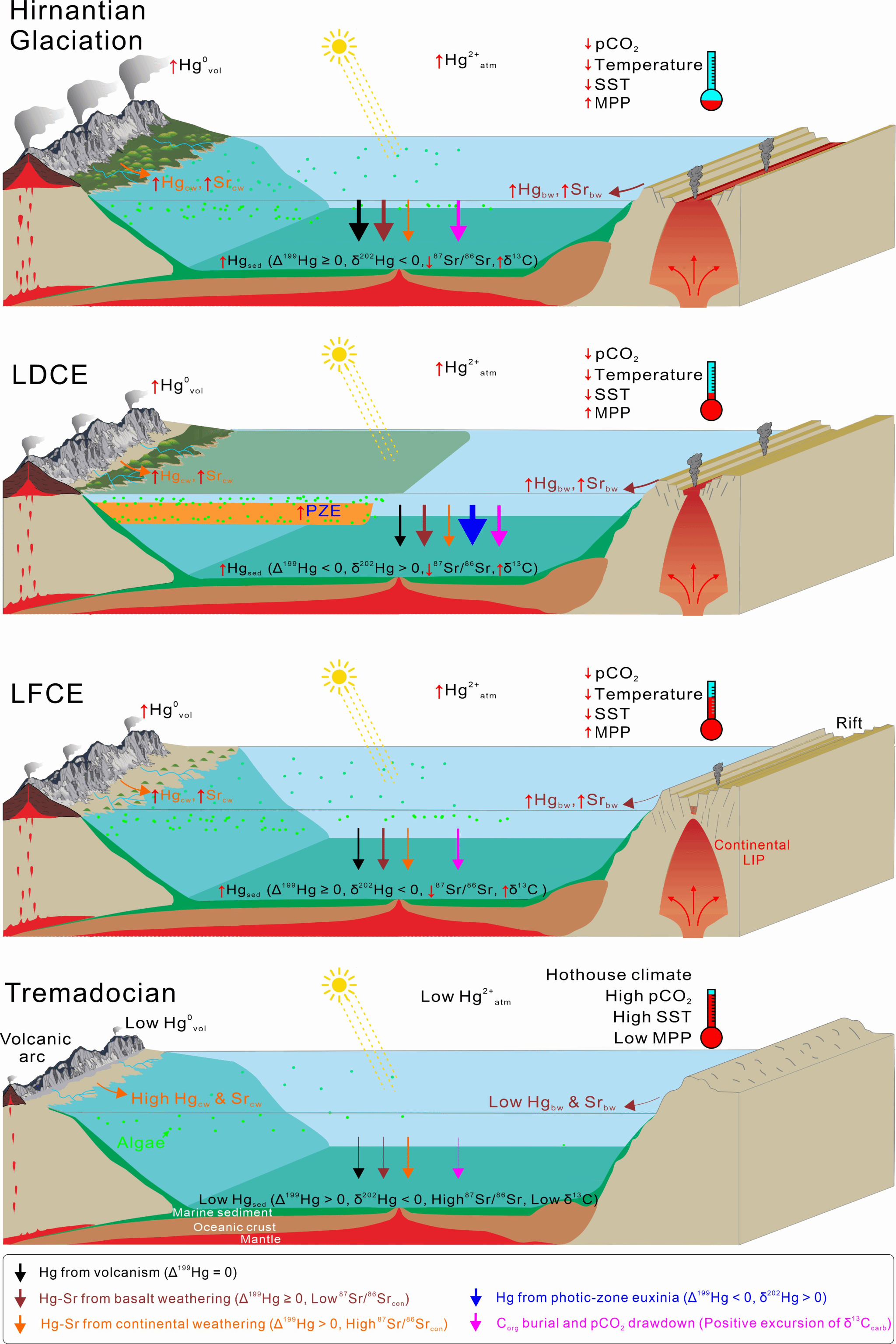 为破解这一关键科学问题,郝芳院士团队成员赵赫特任教授联合51风流 (武汉)张磊副研究员以及美国辛辛那提大学Thomas Algeo教授等,在郝芳院士的指导下,关于奥陶纪长期降温事件的背后驱动机制方面取得重大进展。研究团队基于华南两条奥陶纪“金钉子”剖面及一条“金钉子”辅助剖面的高精度生物地层格架,首次系统重建了贯穿整个奥陶纪的极端气候(古温度)与火山活动序列;发现了奥陶纪气候存在早-中奥陶世之交(LFCE,Floian期晚期降温事件)与中-晚奥陶世之交(LDCE, Darriwilian期晚期降温事件) 两次明确的全球性降温事件,并与赫南特冰期共同构成“三幕式”冰室气候精细演变模式;基于显生宙大数据和研究剖面多种Hg元素富集指标的阈值,识别出奥陶纪在Floian晚期、Darriwilian末期至Sandbian、Katian中期、Katian晚期至Silurian早期多阶段火山来源Hg的增强信号;精细刻画了汞同位素分馏的控制机理具有阶段性特征:在~485-473 Ma 和~468-448 Ma 区间,主要由大陆风化作用(尤其是玄武岩风化)及海洋透光带硫化环境(PZE)主导,而在 LFCE 事件和Hirnantian冰期期间,则主要由火山活动主导的控制机理;首次系统揭示了大火成岩省火山作用(而非大陆弧火山作用)与奥陶纪长期气候变冷之间的耦合关系,提出了“大火成岩省火山活动—玄武岩风化—碳封存—气候变冷”的核心新机制,挑战了以造山运动和早期植物扩张为主导的传统观点。该研究将奥陶纪气候变化的驱动机制从“地表主导”的传统模型转向“深部过程驱动-地表反馈放大”的新范式,为审视当今全球气候变化进程和地球宜居性演变提供了新的案例与关键科学依据。
