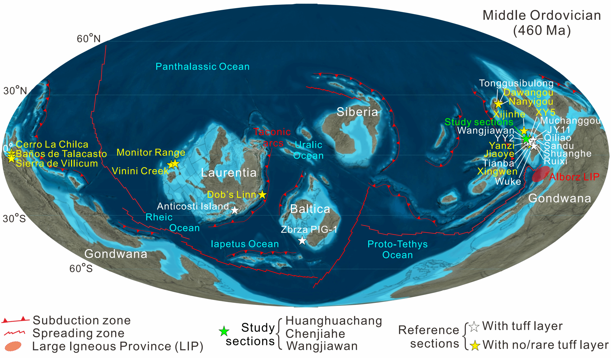奥陶纪是地球表层生物环境突变的关键转折期,温室气候在这一时期被逐渐打破,海洋生物迎来了蓬勃发展(奥陶纪生物大辐射事件,GOBE),直至奥陶纪末期全球气候发生剧烈波动(赫南特冰期),诱发了显生宙第一次大灭绝(晚奥陶世生物大灭绝,LOME)。传统观点认为,奥陶纪降温过程从早奥陶世初期持续加强,可能与造山运动和早期陆地植物扩张引发的硅酸盐风化增强,海洋初级生产力提高,及由此导致的大气二氧化碳浓度下降等因素相关,而最终赫南特冰期的形成可能归因于强烈的大陆弧火山作用(导致华南奥陶系-志留系之交广泛且频繁出现的火山凝灰岩)的贡献。目前有关奥陶纪气候、环境、生物事件的精细过程和驱动机制研究多聚焦于LOME,缺乏对跨度约~40个百万年的整个奥陶纪的宏观分析,地球深部岩浆作用与奥陶纪气候演变的耦合关系仍难以确定。