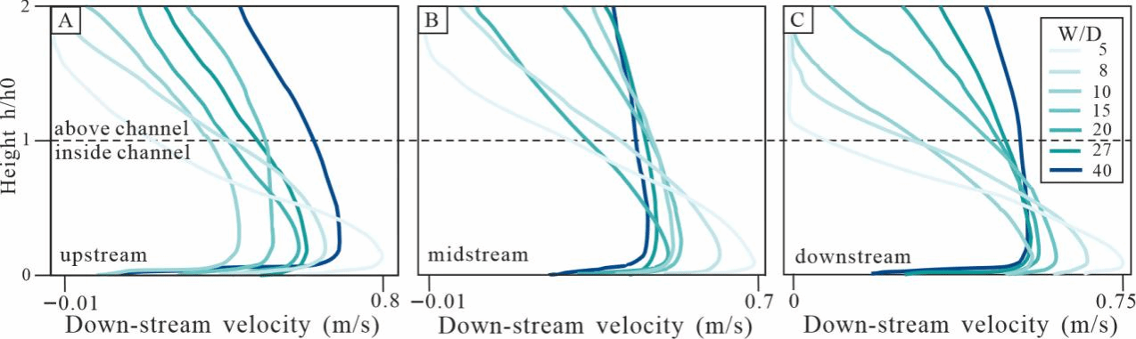 图4. (A)上游、(B)中游及(C)下游处沿水道轴线的重力流方向流速分布。由于模拟案例具有不同的水道深度,故对深度进行归一化处理,以便在不同宽深比条件下进行跨案例比较