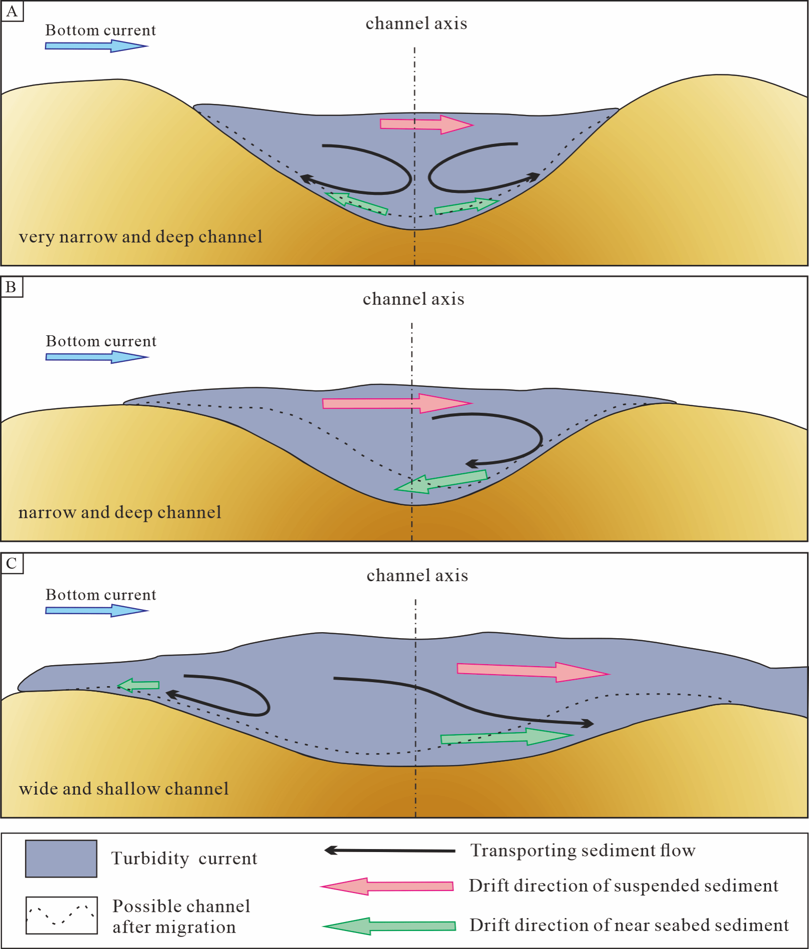 研究结果表明,水道限制性的变化调控着重力流与底流交互作用强度,进而改变水道内流速分布和二次流环流结构,最终影响近床底沉积物的动力学响应。随着宽深比增加,交互作用增强,水道内二次流位置由顺底流一侧移至逆底流一侧,相应地,近床底沉积物的优势输运方向亦由向底流上游偏移转变为向底流下游偏移。①对于极强限制性水道:底流影响主要位于水道上方,重力流则基本限制在水道内部,两者交互作用极弱。水道内流体行为与无底流时的重力流类似,受湍流各向异性主导的二次流控制,因此水道基本不发生侧向迁移。②对于中等限制性水道:此类水道具有较小宽深比,但底流已能对重力流产生显著影响。交互作用下在水道下游形成由底流重力流剪切压力差驱动的二次环流,将下游近床底沉积物输运至上游堆积,促使水道整体向下游迁移。③对于较弱限制性水道:宽深比较大,重力流底流交互作用较强。底流翻越水道壁后直接下沉,将沉积物输移至下游堆积,而上游形成的二次环流极弱。该机制导致水道倾向于向上游迁移。