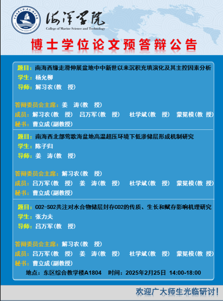 2025年春海洋学院博士生学位论文预答辩公告(2月25日)