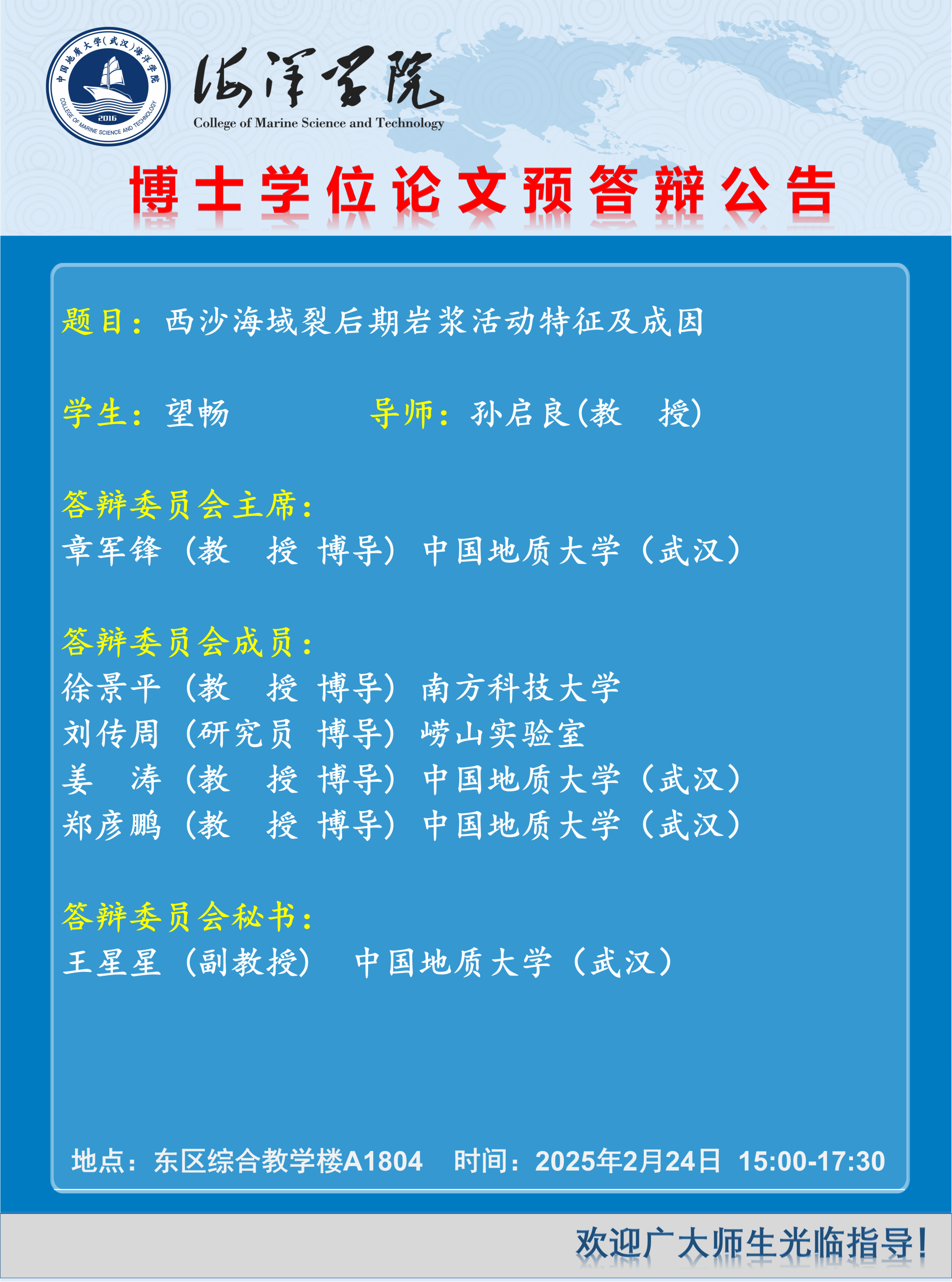 海洋学院2025年春博士学位论文预答辩公告(2月24日)